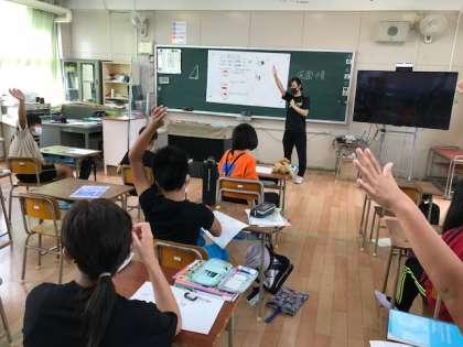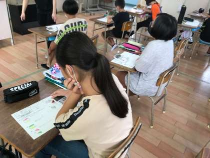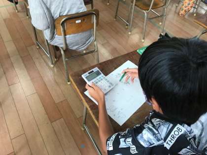 6年生の算数科の学習で、立体の体積を求めていました。「底面積かける高さ」で求めるのですが、底面積が難しい問題もありました。計算は電卓を使うのですが、計算の順番を間違えないように頑張っていました。