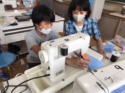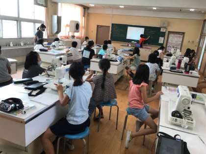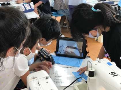 5年生が家庭科の実習でミシンの使い方を学んでいました。直進縫い、返し縫い、方向転換をしていました。分からない時はタブレットで動画を確認していました。