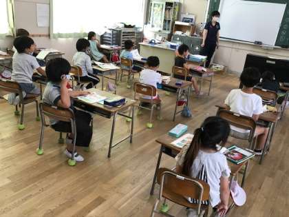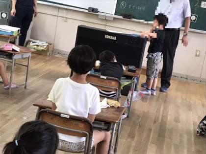 1年生が算数科の学習で、オルガンが教室のドアから出せるかどうかを考えていました。運ぶ前に調べる方法をいろいろと考えていました。ノートの長さを使うという方法にみんな感心していました。