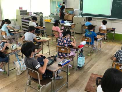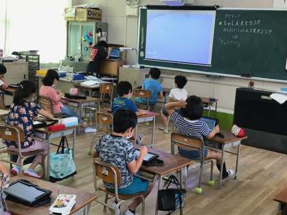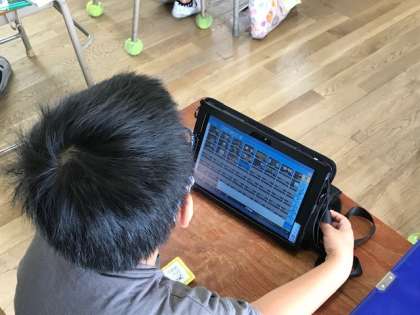 2年生が前回の続きのタブレット学習をしていました。今回は写真を共有して、友達の写真を自分のタブレットで見ます。お互いの作品を見て楽しい時間でした。