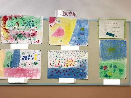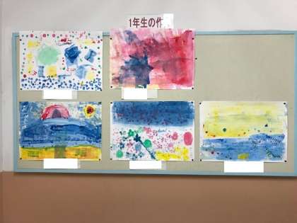1年生の絵の具を使った作品です。ローラーで好きな色を塗っていき、自分の思いを表現しています。塗っていって何に見えてきたのかな?