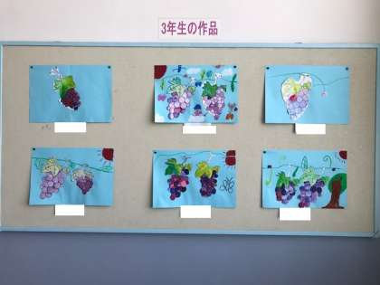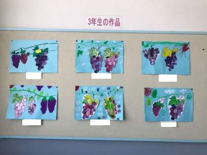 おいしそうなブドウが実っています。まるでぶどうがりに来たような3年生の作品です。1粒1粒色の濃淡を変えてブドウらしさを表現しています。