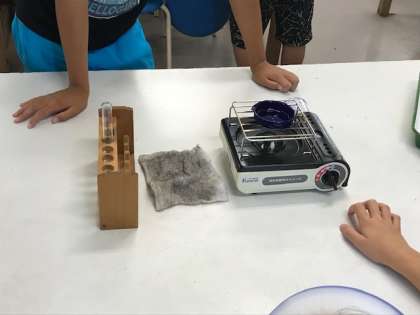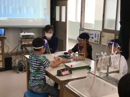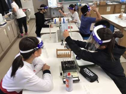 6年生の理科の学習です。無色透明の水溶液を加熱して、蒸発させると何が残るのか?食塩水や炭酸水など、班ごとに実験します。実験時にはフェイスガードが必要ですね。