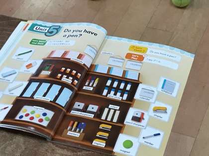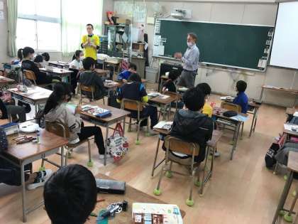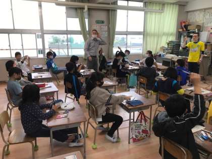 4年生の外国語活動です。ネィティブの先生の発音をよく聞いて、リピートします。