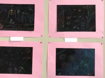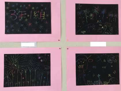 3年生の図工科の作品です。パスで画用紙にたくさんの色を塗ります。その上から黒のパスで塗りつぶし、あとは線をつけると鮮やかな色の作品になります。どの子の作品も個性豊かですね。