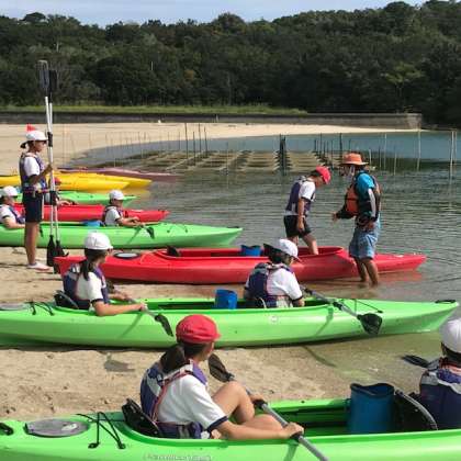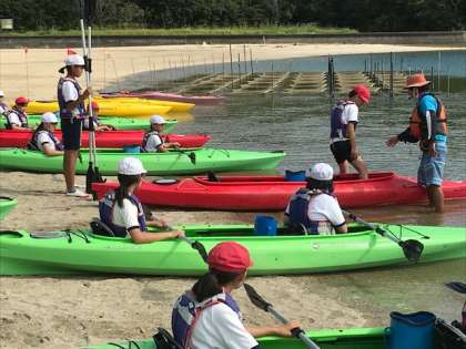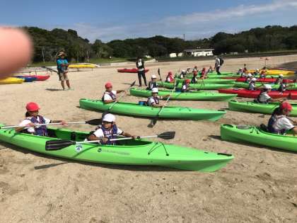 カヤックに乗り込んで、こぎかたの陸上練習です。
