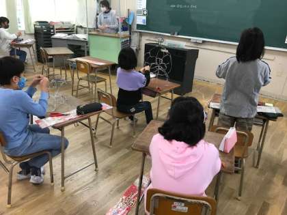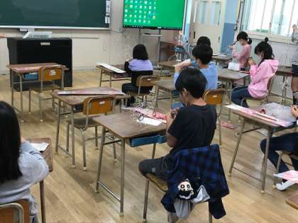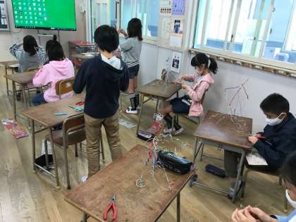 5年生がはり金を曲げてつないで自分だけのタワーを作っていました。図工科の学習で、創作活動に近いです。イメージを作品にするのは、高学年ならではの学習です。