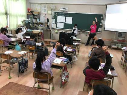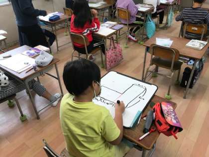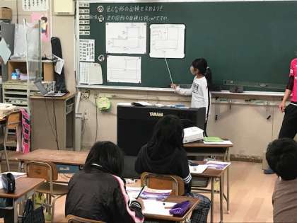 4年生が算数科で複雑な図形の面積を求めていました。ホワイトボードに自分たちの考えを書いて、代表の人が発表していました。3つ目の方法は難しいようです。