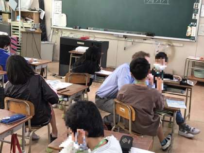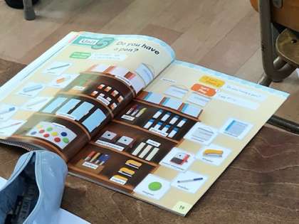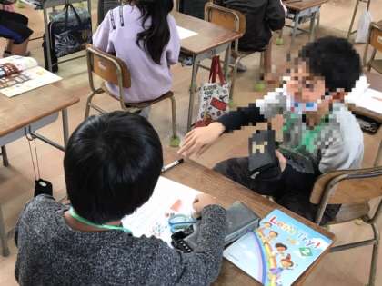 4年生の外国語活動で、文房具を学びました。2人組になって聞き合います。