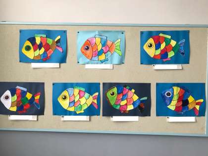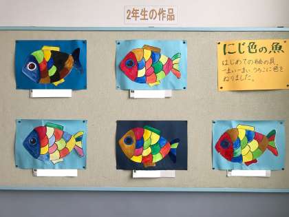 2年生の絵画作品です。絵の具を使って魚のうろこを1枚1枚ていねいに塗りました。水で薄めてい色の濃淡をきれいに表現しています。
