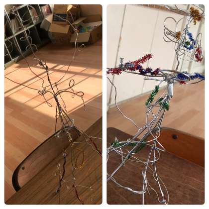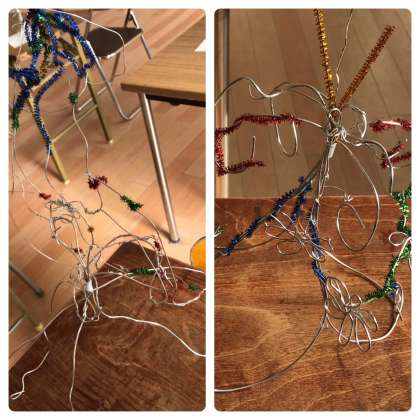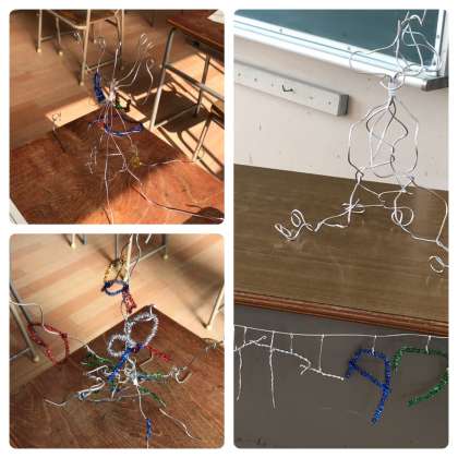 5年生の立体作品です。はりがねを折り曲げ世界に1つの自分だけのタワーを作りました。形やモールの配置、高さ、広がりなどどの作品も個性があふれています。