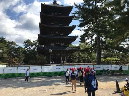 奈良公園に到着しました。興福寺の金堂や五重塔を見学しました。あちらこちらに鹿がいるのでみんなとても興奮しています。