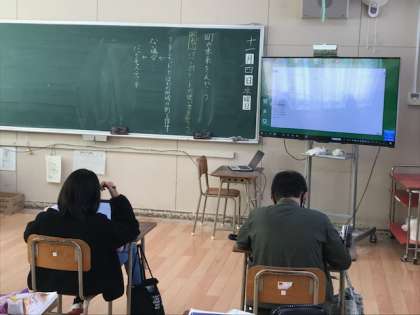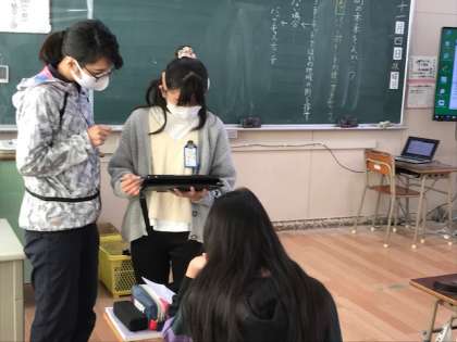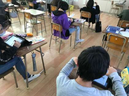 6年生は、「町の幸福論」で新しい町作りのために他の地域の良いところはないか、タブレット端末で調べていました。自分の考えを整理するための学習です。