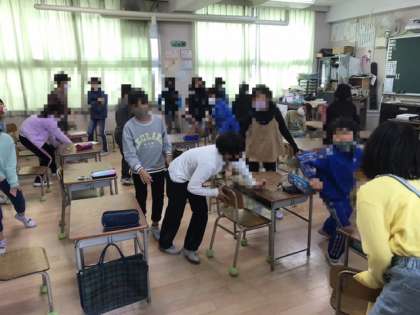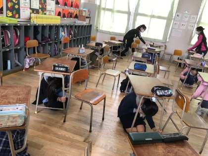 地震の発生時は机の下に避難して、頭や体を落下物から守ります。その後避難開始です。