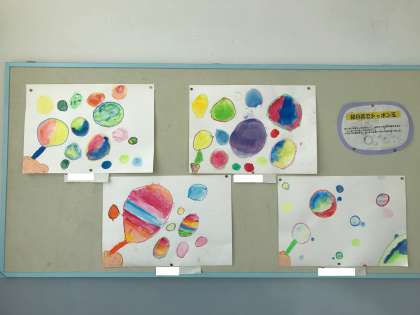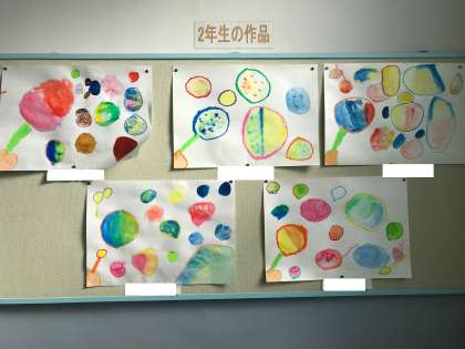 2年生の作品「絵の具でシャボン玉」です。絵の具をにじませて表現しています。水の量や絵の具を混ぜる量などを調整して表現されています。