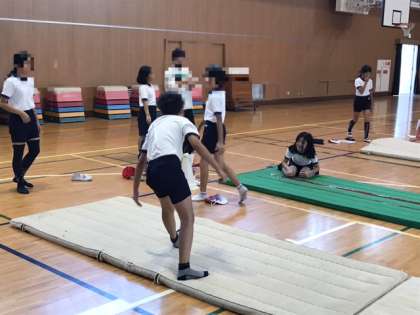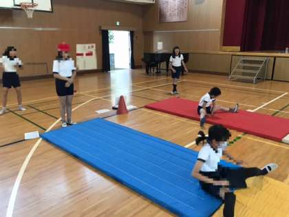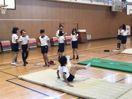 5年生が体育科でマット運動をしていました。開脚前転や開脚後転、腕立て側方回転、逆立ちと5年生は難しそうな技にチャレンジしまいました。