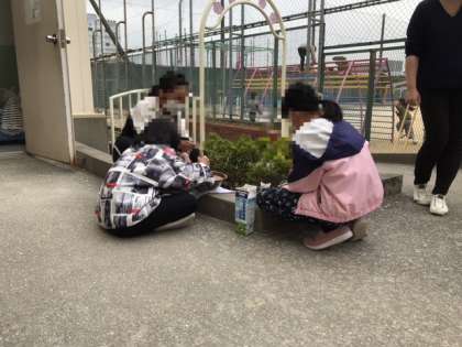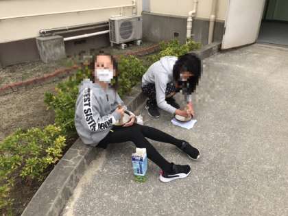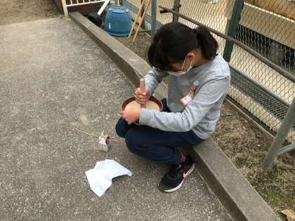 5年生ご育ててきたお米の収穫です。イネを干して、乾燥したお米の脱穀を始めていました。すり鉢でもみ殻と米に分けます。「昔の人の気持ちがわかる。」そうです。