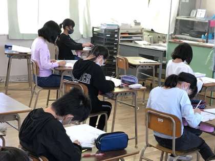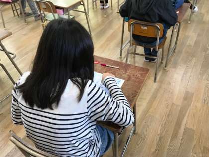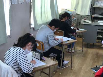 5年生の書写の学習です。筆順を指書きで確認する子、姿勢を意識して整える子、筆圧を意識する子など様々に書写に取り組んでいます。
