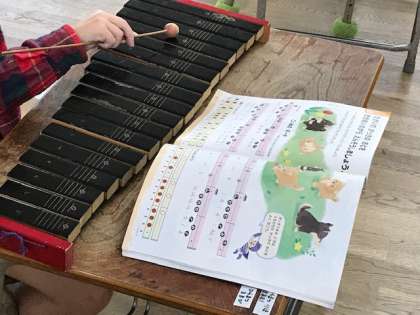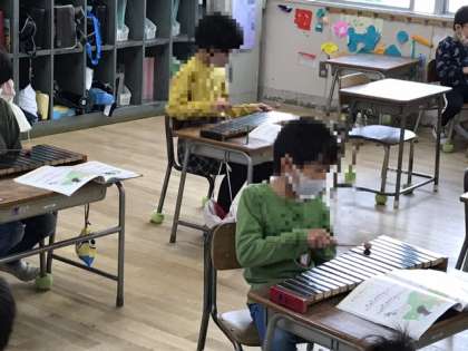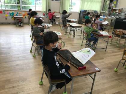 1年生の合奏です。曲は「こぐまのマーチ」です。木琴と鈴を使って演奏していました。ミドミドミソソ〜と上手になってます。
