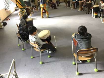 今日は第2回目のアフリカンパーカッションの日です。1年生の子どもたちはとても楽しみにしていました。今日は1人に1ずつ楽器を貸してもらい演奏しました。