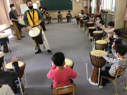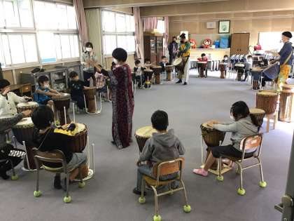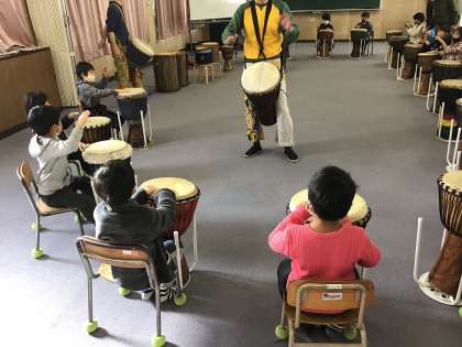 円形に座って、リズムに合わせてみんなで演奏です。プロに教えてもらってとっても楽しいリズムを奏でました。
