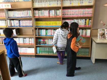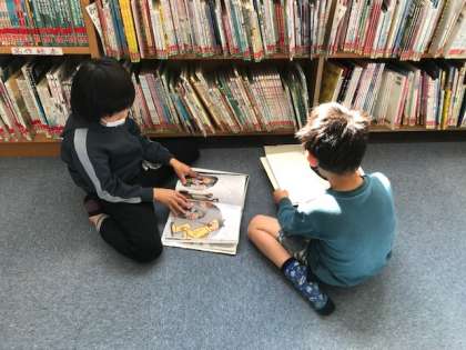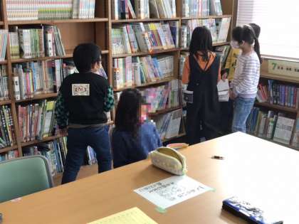 2年生の図書の時間です。何を読もうか、どれを借りようか、子どもたちはいろいろな本を手に取って悩んでいます。たくさんいい本に出合って欲しいです。