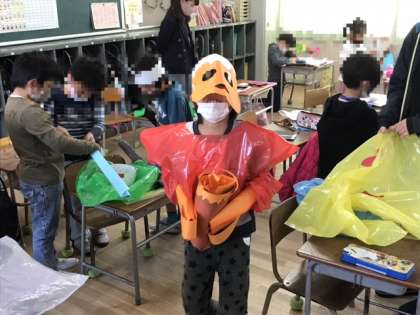 2年生が図工科の時間に、いろいろなキャラクターに変身していました。鬼滅の刃の登場人物やクマのプーさん、ウサギさんと豊かな発想で作品を身につけていました。