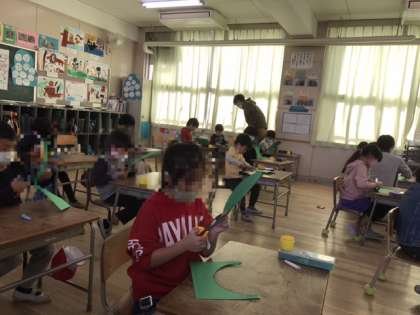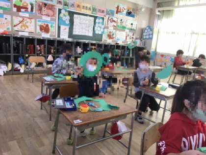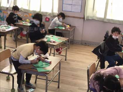 1年生の図工科の時間に「クリスマスリース」を作っていました。画用紙とパンヤ綿、銀色のテープ、色紙を使っていました。完成が楽しみです。