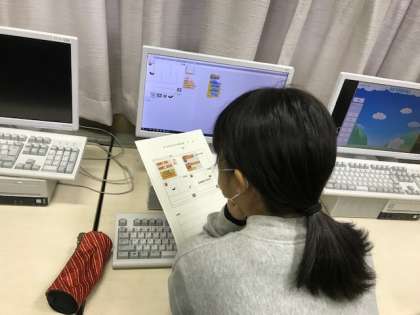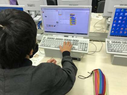今日は、6年生が登校する土曜授業です。パソコンルームで、スクラッチを使ったゲームのプログラムを書いていました。完成が楽しみですね。