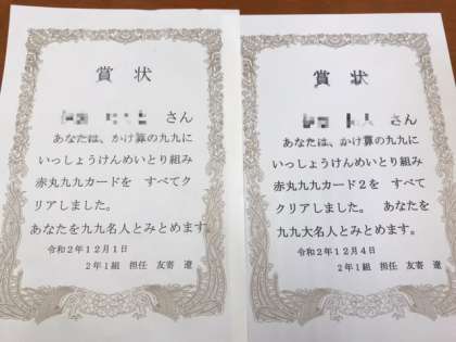 12月最初の月曜日の朝は、どの学年も静かに朝の学習に取り組んでいました。3年生は、5分間ドリルや読書をしていました。漢検の学習をしている学年もありました。朝から九九の賞状をもらった子はとっても嬉しそうです。