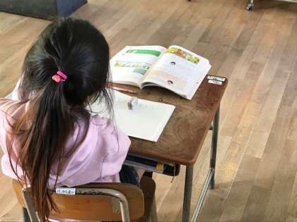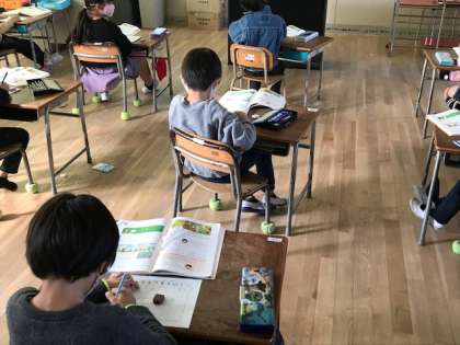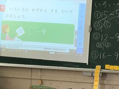 1年生は、算数科「くりさがりのある引き算」です。12ー9のような計算を10-9=1、2+1=3と解きます。みんなていねいに頑張っていました。
