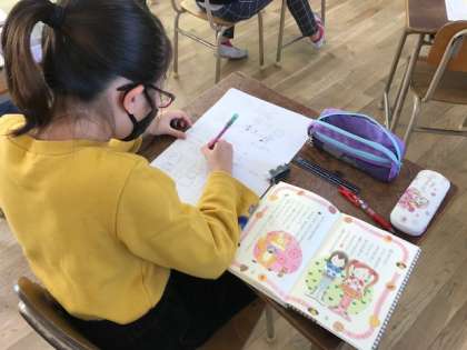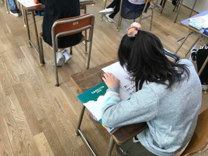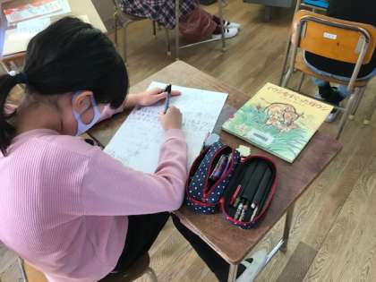 5年生が「おすすめの本」のポスターを作っていました。挿絵や感想を丁寧に書いて、おすすめのところなども書いていました。