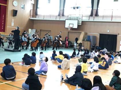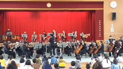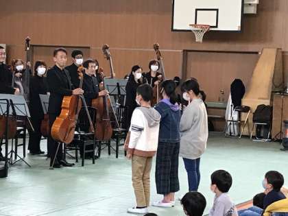 最後の曲は「池島小学校校歌」です。指揮者が交代して校長先生が指揮をしました。子どもたちは大喜びでした。代表の6年生がお礼の挨拶をして楽しい時間は終わりました。