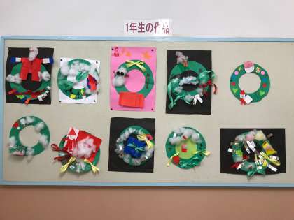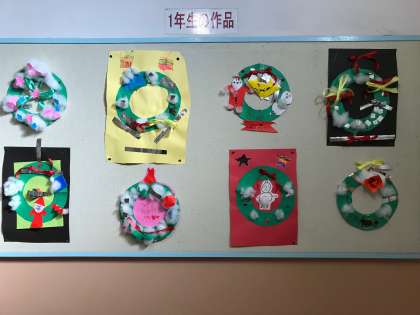 1年生が先日作っていたクリスマスリースが完成しました。個性いっぱいのかわいい作品です。