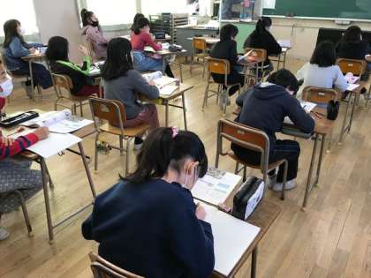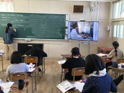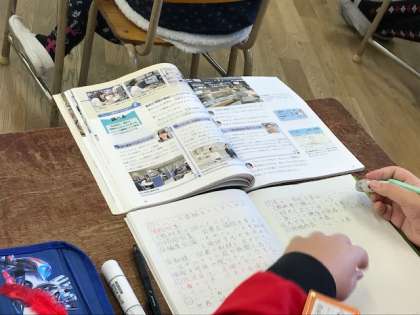 5年生の社会科の学習です。テレビの報道番組がどのようにできているのかを調べます。教科書や資料集から、それこそ情報を集めていました。