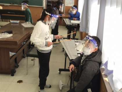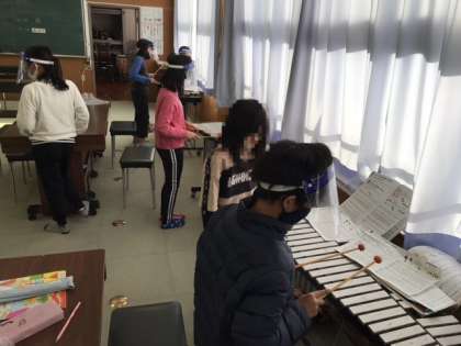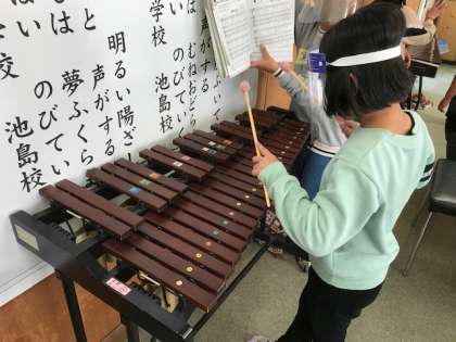 4年生が音楽科の時間に打楽器の練習をしていました。全員が弾けるように頑張っていました。