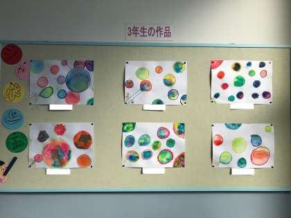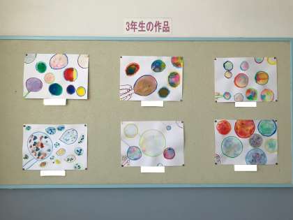 3年生の絵画作品です。シャボン玉の色の付け方がとてもきれいですね。水彩絵の具の透明感がとてもよく表現できています。