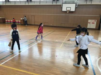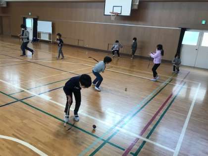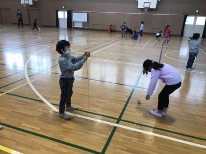 1年生は、講堂で、韓国のコマ(ペンイ)や日本のコマ、羽子板ではねつきをしていました。上手に回したり羽をついたりしていました。