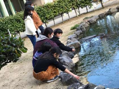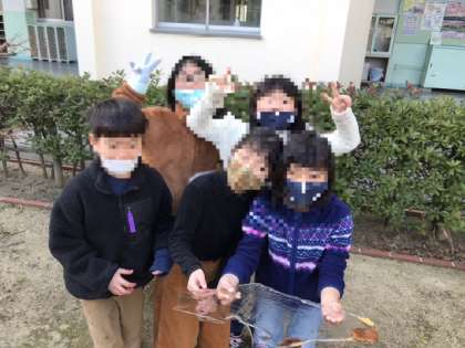 3年生が先生と一緒に池の氷の観察です。大きな氷を持って記念撮影です。