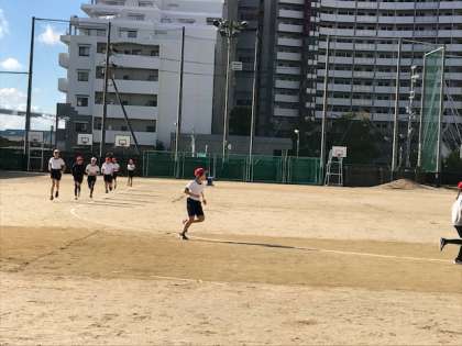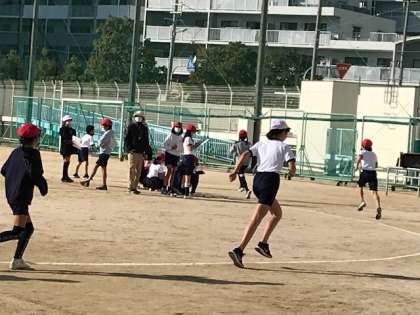 5年生が体育科の学習でかけ足をしていました。ペアの子が「少しペースがはやいよ。」「いい調子だよ。」など声をかけながら、走っている子は、その声に励まされながら走っていました。