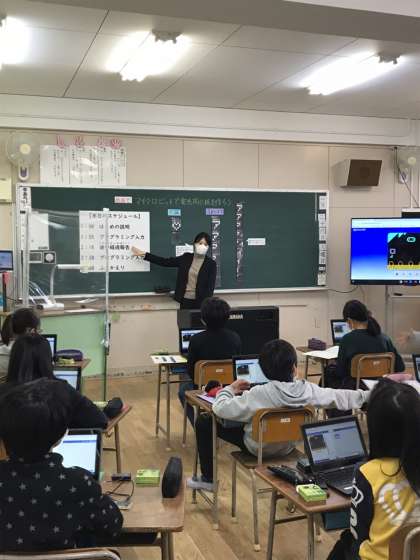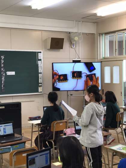 作った電光掲示板をみんなに見せて、どんな場面で使えるのか発表しました。見る人を意識した発言ばかりでした。