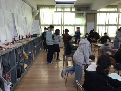 受験する級によって教室が変わります。まもなく始まるので移動です。教室は全ての掲示物に張り紙をしています。