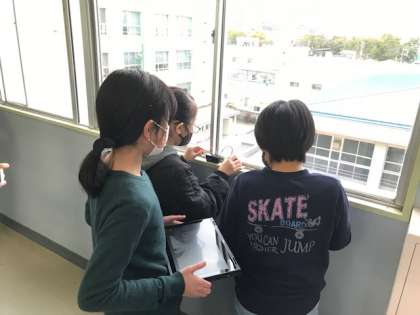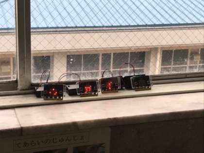 5年生がプログラミング学習で作成した電光掲示板を設置して動画撮影をしていました。掲示に合わせた場所を選んで撮影です。