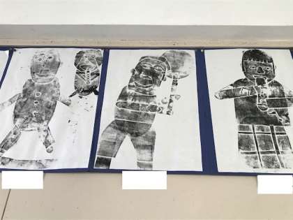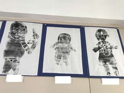 3年生の教室の紙版画です。1人1人の表情や動きがすばらしい。とても上手にできています。ていねいな作品ですね。