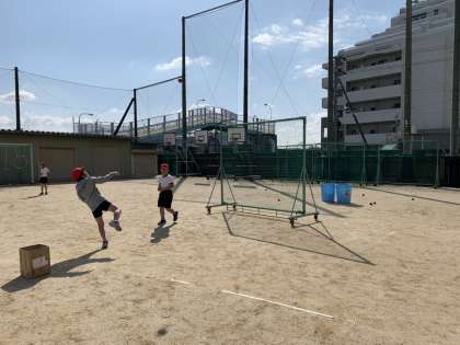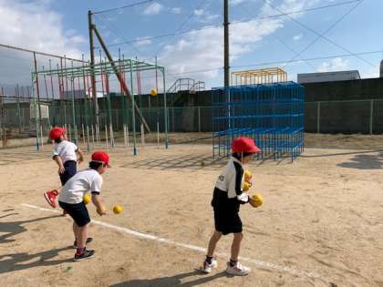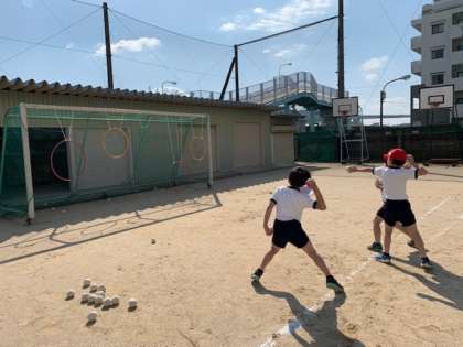 2年生の「投げる運動遊び」です。的にボールを当てたり、フープに通したりします。上投げが上手にできるように頑張ります。