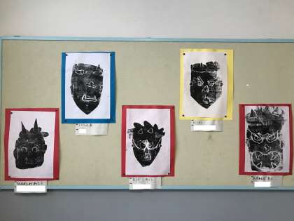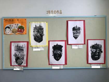 2年生がおいはらいたい鬼を版画で作りました。ねぼうおに、わすれんぼうおに、いらつきおに、くいしんぼうおに。おいはらえますように。