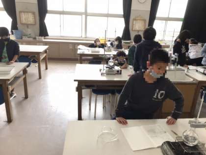 4年生の理科で「水の温度変化」の実験をしていました。フラスコの中の水は温め続けるとどうなるのか。温度の変化と状態の変化を調べます。「なんか減ってる。」はすごい発見です。