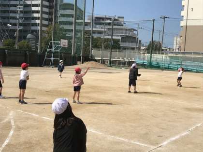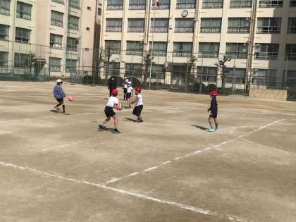 2年生の体育科の学習では、前回の投の運動遊びで身に付けた投げる力を使って、「パスシュートゲーム」をしています。味方のパスをもらってシュートします。的に当たれば1点。
