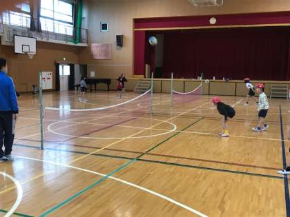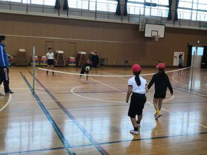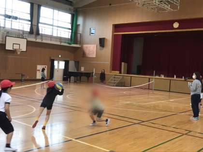 3年生が体育館でプレルボールをしていました。ネット型のゲームです。ボールを追いかけて捕まえるところが楽しいゲームです。