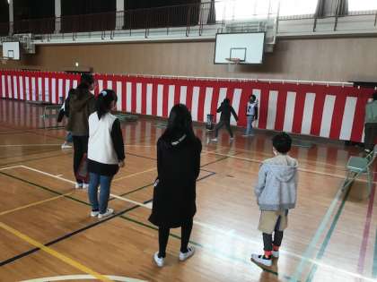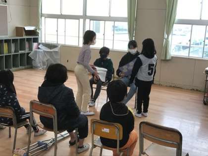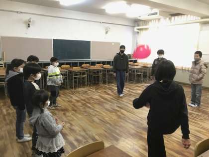 今年度ラストの縦割り班活動てす。バトンを引き継いだ5年生が考えて、ハンカチ落とし、風船リフティング、だるまさんが転んだなど